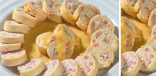 1. Extendemos un  filete y salpimentamos, ponemos una loncha de jamón y otra de queso, hacemos un rollito. Para sujetarlo, podemos atravesarlo con palillos de dientes, o atarlos con cordel de cocina.