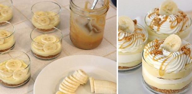 2. Después añade una capa de crema pastelera y tres rodajas de plátano.