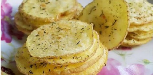 Y ya tenemos unas estupendas y crujientes patatas fritas en microondas listas para picotear. He dejado la piel a las patatas para darles un aire más rústico, pero si lo prefieres puedes pelarlas.