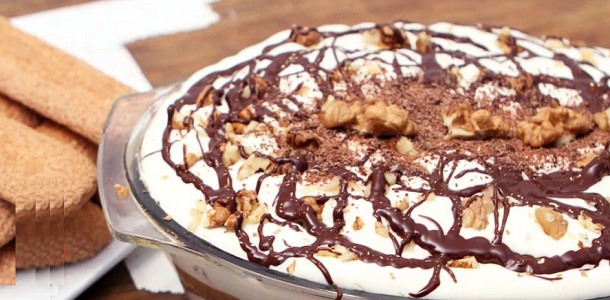 8. Volvemos a colocar un piso de vainillas remojadas en licor de café y cubrimos con crema, nueces partidas y chocolate rallado. Al ser la última capa le ponemos el chocolate derretido buscando hacer líneas irregulares