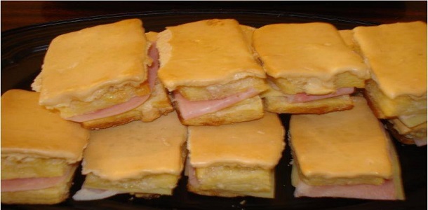 1. Mezclar los ingredientes secos primero. Batir la manteca hasta que este cremosa. Agregarla a los ingredientes secos junto con la leche y la yema de huevo. Estirar la masa hasta que tenga medio cm. de espesor, pintar con manteca derretida y doblar en cuatro. Volver a estirar y repetir varias veces para lograr el hojaldrado. Finalmente estirar hasta que tenga 1/2 cm. y cortar en rectangulitos del mismo tamaño. Sobre cada rectangulo colocar jamon y queso y cubrir con otro rectangulo