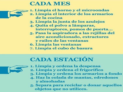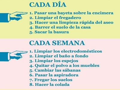 Si queremos mantener la casa limpia, bastará con que cada día nos repartamos algunas tareas e invertir menos de 15 minutos a la limpieza de nuestro hogar. Como veremos en la lista que hemos preparado a continuación, hay tareas que debemos realizar todos los días,y que son las más básicas, y otras que realizaremos de forma semanal, mensual o trimestral.