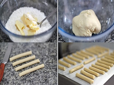 La Masa lista es hora de modelar. Para ello retire un pedazo de la masa, haga cubiertas y corte en el tamaño deseado. Es importante que los palitos sean finos, del espesor de un lápiz.
