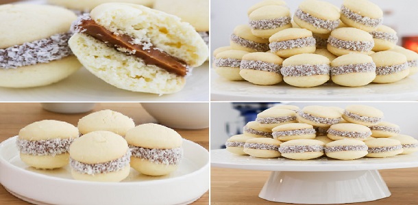 12. Pegar de a dos masitas con abundante dulce de leche y pasar el borde de los alfajores por coco.