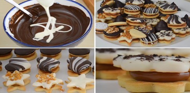 1. Poner un poquito de mermelada de fruta sobre la mitad de las masas, tapar con la otra mitad y cubrir con azúcar impalpable.